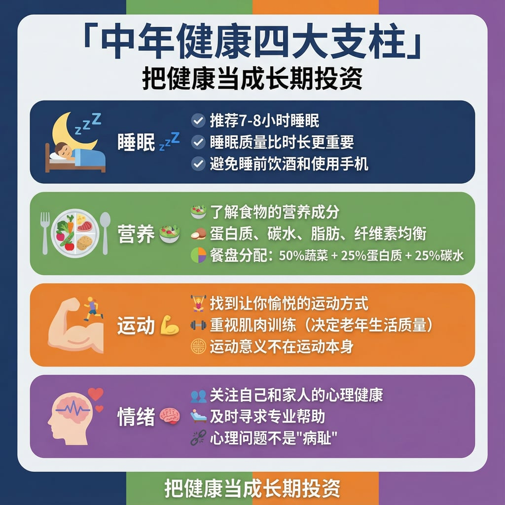 很多人总觉得健康是一笔糊涂账:想顾身体,却不知道从哪儿下手;想改习惯,又坚持不了几天。其实健康没那么复杂,真正决定你状态的,可能就四件事:睡眠、营养、运动、情绪。
